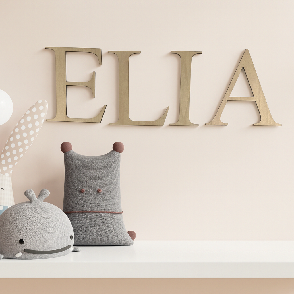 Prénoms gravés en bois de boulot de 3 mm. Peinture possible en chêne foncé. Dimensions entre 15cm et 40cm. Faciles à fixer avec du double-face. Autres écritures disponibles sur demande.
